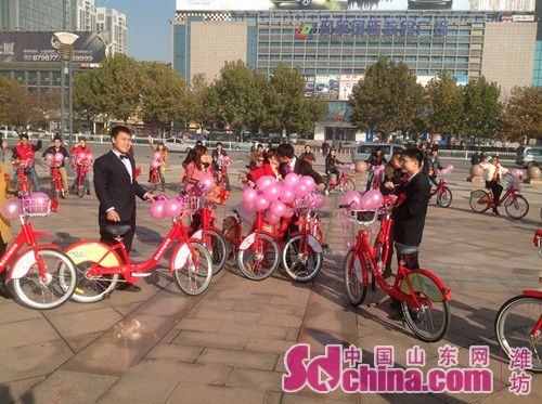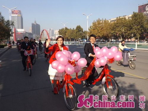 濰坊公共自行車試運(yùn)行以來,得到了市民的認(rèn)可和喜愛。記者在濰坊市公共自行車管理處了解到,用公共自行車來代替“婚車”在濰坊并不是第一例了,這樣的婚禮不僅低碳環(huán)保,又浪漫時(shí)尚。婚禮中的公共自行車是濰坊公共自行車管理處在了解了他們的情況之后免費(fèi)提供的,新郎表示十分的感謝,并呼吁更多的市民加入到低碳出行的隊(duì)伍中來。