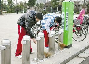 中國徐州網(wǎng)-都市晨報 昨日下午,二十六中15名初中生來到九龍湖公共自行車停放點義務(wù)擦車。