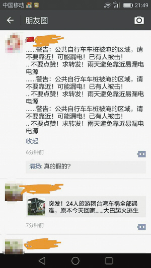 19日晚上,網(wǎng)友“清揚(yáng)”發(fā)現(xiàn)朋友圈里不時(shí)有網(wǎng)友轉(zhuǎn)發(fā)一則提醒消息,這條消息看起來(lái)很貼心,但也讓人不免產(chǎn)生恐慌心理。這條消息內(nèi)容如下:“警告:公共自行車(chē)車(chē)樁被淹的區(qū)域,請(qǐng)不要靠近!可能漏電!已有人被擊!不要點(diǎn)贊,求轉(zhuǎn)發(fā)!雨天避免靠近易漏電電源?!迸笥讶D(zhuǎn)發(fā)這條內(nèi)容時(shí),有人還配上公共自行車(chē)的圖,有的是將上面的內(nèi)容連說(shuō)三遍,以引起受眾注意。